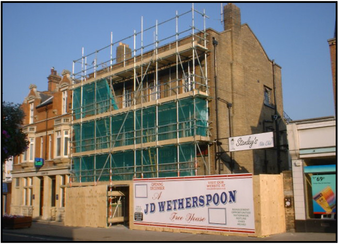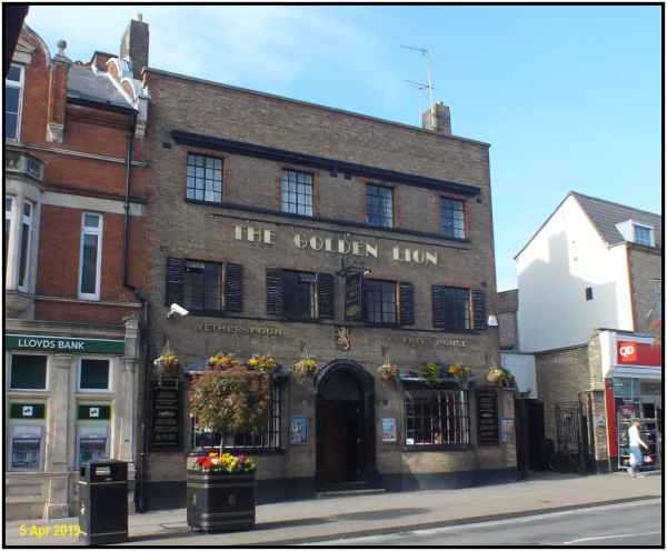 the Golden Lion now trades under the J.D.Wetherspoon banner. Prior to Wetherspoon's take over the premises had gone through a bad patch Discos, karaoke, a night club at the rear, various refurbishments seem only to have attracted the wrong element. Fights in the High Street adjacent to the premises were frequent, but not always attributable to the Golden Lion. In 1990 plans were actually submitted to convert the frontage into two shops and have three storey offices at the rear. In the event a night club started at the rear (various identities), which seems to have avoided a rebuild and Wetherspoons took it on in 2001 which calmed things down. It is now, 2023, one of only four pubs/hotels open along the whole of the High Street. |