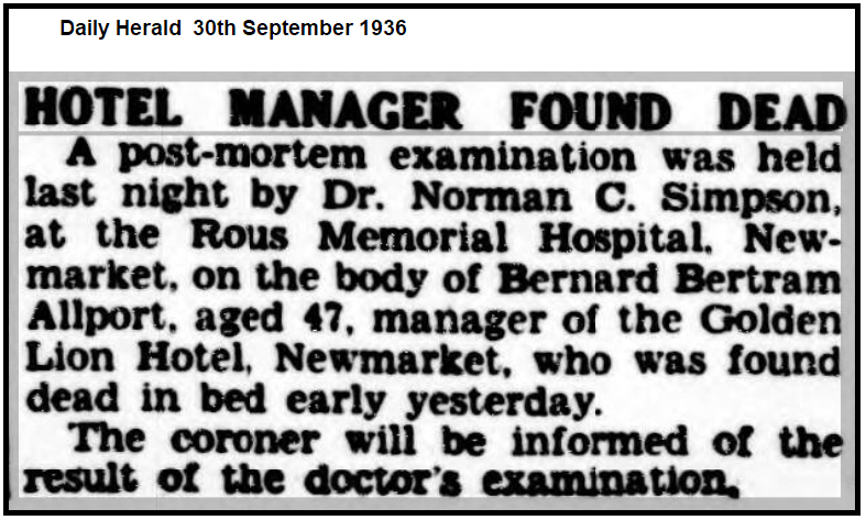 | 1936 (Feb to Sep) | Ernest Bertram Allport (died at hotel) | Newmarket Journal | |