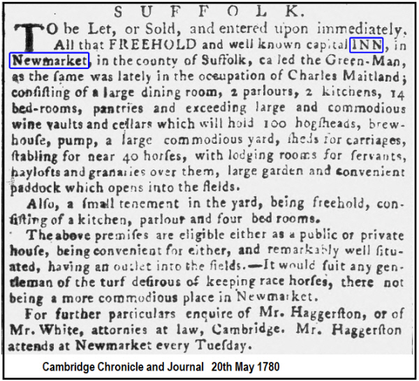 estate agents, Willow Hair Consultants and Khobkhun Thai Restaurant Further investigation reveals the Green Man, Newmarket to be the location of several auction sales listed in various Anglian newspapers between 1767 and 1786. Bury Records office has the lease (Ac389 in 61E Box1) which is basically stuff not catalogued yet, just jumbled up in the box. The lease was taken by apothecary Thomas Searncke, jointly with Robert Warren(innkeeper) for one year, in 1760. Leased from Thomas Scotman who had inherited it in his mother's will in 1741(probate 1743 IC5001197(13)0. It lists other names, presumably previous innkeepers Robert Warren - Andrew Denton - John Dawson - ? Wheatley - James Shade - Daniel Knott - William Delamore, who built it on land he purchased from Richard Nelson. Then Rachel Wood found a further reference, which predate the above Suffolk records office Reference: HD 1714/1 Title: Property in Newmarket and Cheveley (Ca), 1637-1719; Goome-Gore or Gains-Gore (10a), Cheveley (Ca), 1637-1719; Messuage, Newmarket, 1662-1719; The Greene Man, Newmarket, 1684; Site of the Hand and Sword, Newmarket, 1703. Evidences of title to property purchased by William Coe of Swaffham Bulbeck (Ca), yeoman later of Newmarket, clothier:- messuage in Newmarket purchased from Thomas Appleyard of Swaffham Bulbeck (Ca), husbandman, 26 Mar 1662; of Goome-Gore (10a) purchased from Anne Blackwell of Newmarket (Ca), widow and Joane Gawen of Newmarket (Ca), spinster, 1 and 2 Jun 1693. Subsequent mortgage and assignments. | |||||||||||