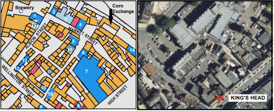 At one time the premises would have comprised all of the yard with access to the High Street and Drapery Row, and that yard possibly extended into Wellington Street. That was when the Moody family had their brewery there, before buying out Charles Phillips for £1,200 in 1865 and moving to his brewery to the corner of Albion Street with Market Street. The Moody brothers were bankrupt by 1869, Robert was running the business and sister Harriet took over and managed for some years to keep the firm going, but in 1896 the brewery and all its pubs were sold to Greene, King. When the pub, as opposed to the Brewery was closed has not been found. The bulk of the newspaper reports are adverts for the Brewery when in the hands of Harriet. An undated advertisement is known of C.B.Bosworth, King's Head Brewery, Newmarket..Corn, Coal, Coke and Forage Merchant, Importer and Dealer n High Class Wine and Spirits In 1900 it was Wrexham House, a grocer/fruiterers run by Joseph Simpson. That became Joseph Proctor's in 1901. In the 1911 census it was Proctor's Fruiterers and Maypole Dairy. Maypole Dairy gave way to DER Radio Rentals after 1953 and the fast food takeaway shop started there in 2004.