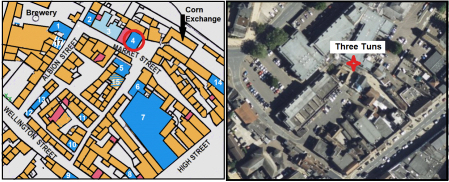 One of the very many Inns in the Rookery area, and like so many was often handed down in the family. Appears to have suffered badly from a down turn in trade at turn of C19-C20.IT is not certain, but the small building to the right may have been an annexe, run as a separate business "The Wine Vaults". The word "Wine" can just be discerned on the window in one photograph. Ultimately the magistrates decided there were far too many drinks outlets in St Mary's ward and the Three Tuns was one of those chosen for closure in 1912-13 It then became a ladies hairdresser, and through an assortment of uses, including of course the obligatory bookmaker, Elijah Moore, before being demolished to make way for the new Rookery shopping precinct in late 1960's/early 1970's Now (2019) covered by The Pantry