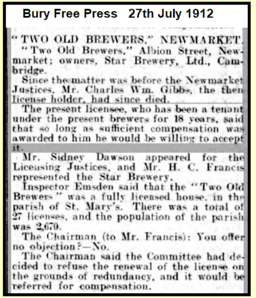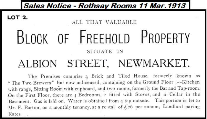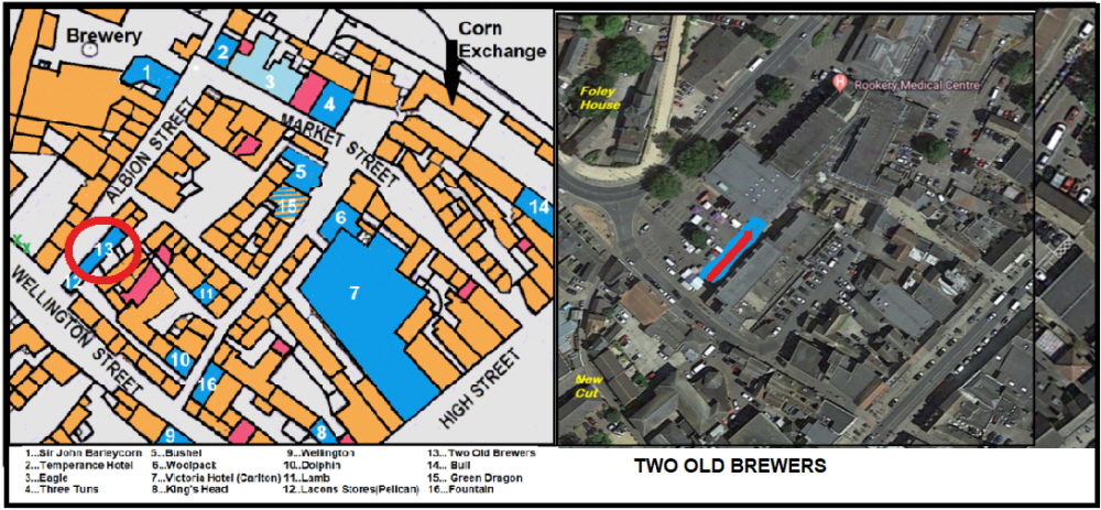 The Two Old Brewers took up about half of the eastern side of Albion Street, from next door to the Albion Stores towards Market Street.It was one of those chosen for closure just before WW1 as the ward of St Mary's had too many beer outlets,(about one for every 100 man, woman and child)